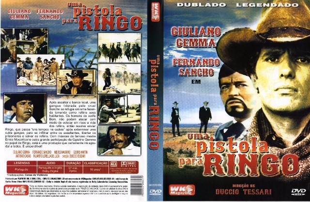 Sinopse: Uma Pistola Para Ringo (Una pistola per Ringo). Após assaltar o banco local, uma gangue liderada pelo cruel Sancho(Fernando Sancho) se refugia em uma fazenda tomando como reféns seus habitantes. Os homens do xerife Bem(George Martin), não podem atacar com medo de colocar em risco a vida dos reféns, então resolve enviar Ringo(Giuliano Gemma), que passa "uns tempos na cadeia" após exterminar uma outra gangue, para se infiltrar entre os assaltantes, libertar os prisioneiros e salvar os reféns. Com músicas do famoso mestre Ennio Morricone.
